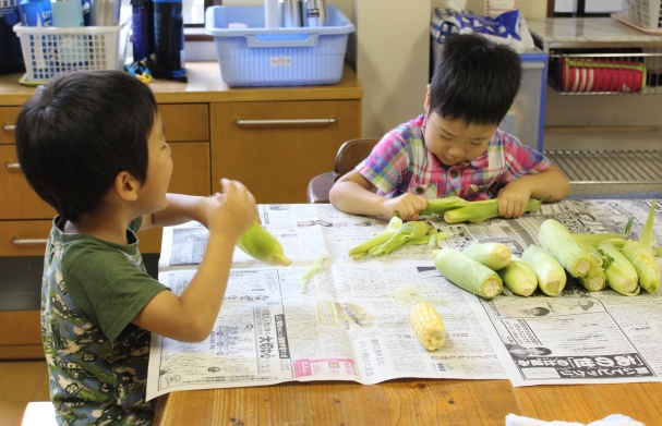 昨日、幼稚園でとうもろこしの収穫体験があって、